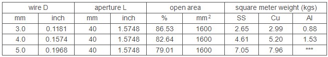 40mm flat top crimped wire mesh Using 3.0-5.0mm diameter wire, by flat top crimped weaving, woven 40mm opening for solid particles. This wire diameter and mesh with ratio reasonable,flat surface, strong wear resistance and firm structure