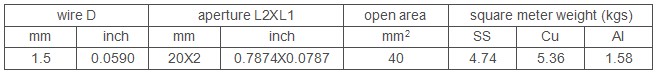 20X2mm slot hole crimped wire mesh Using 1.5mm diameter wire, by slot hole crimped weaving, woven 20X2mm opening for solid particles. This wire diameter and mesh with ratio reasonable,flat surface, strong wear resistance and firm structure.