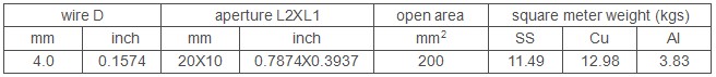 20X10mm slot hole crimped wire mesh Using 4.0mm diameter wire, by slot hole crimped weaving, woven 20X10mm opening for solid particles. This wire diameter and mesh with ratio reasonable,flat surface, strong wear resistance and firm structure.
