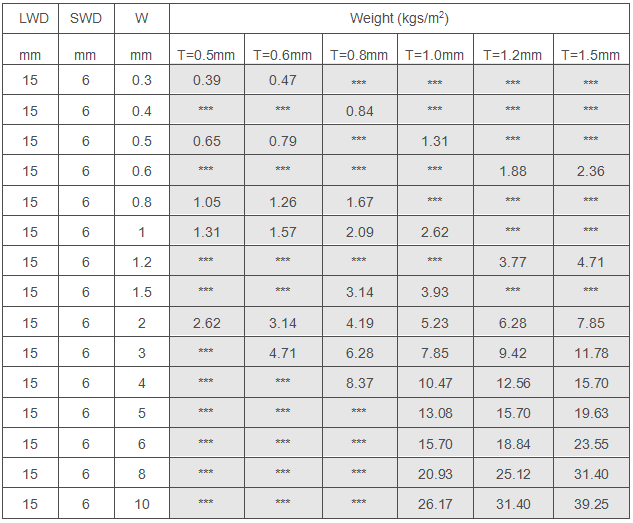 15x6 mm aperture light expanded metal is made from 0.5-1.5mm thickness metal plate by uniformly slit and stretched,forming 15x6 mm small diamond opening in the metal sheet. The mesh is with features of light-weight,small opening,thin plate and long service life. It is widely used for car grilles,filter cartridges,barbecue mesh,speaker grilles,crafts and decoration,children seat,furniture and office supplies,ceiling roof mesh and so on.