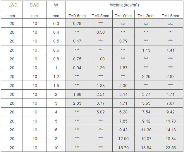 20x10 mm aperture light expanded metal is made from 0.6-1.5mm thickness metal plate by uniformly slit and stretched,forming 20x10 mm diamond opening in the metal sheet. The mesh is with features of light-weight,small opening,thin plate and long service life. It is widely used for car grilles,filter cartridges,barbecue mesh,speaker grilles,crafts and decoration,children seat,furniture and office supplies,ceiling roof mesh and so on.