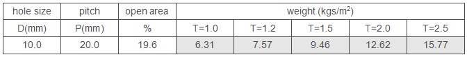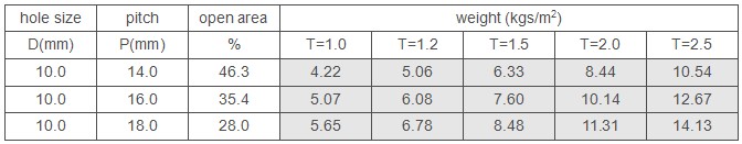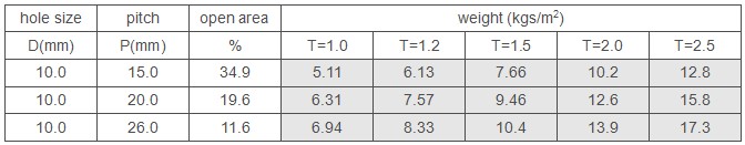 10mm round hole perforated metal mesh is made of metal plate match 10mm aperture punching die, by CNC punch pressing, cutting, slicing, leveling, grease, deburring, and surface treatment processes of roll or sheet mesh. We have 14 complete production lines and advanced numerical equipment, it will be combinations of different material ,pitch and opening rate,to produce more specifications mesh,it is widely used in protection, decoration, filtering fields.
