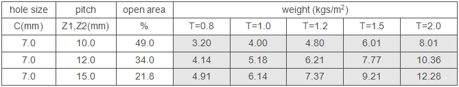 7mm square hole perforated metal mesh is made of metal plate match 7mm aperture punching die, by CNC punch pressing, cutting, slicing, leveling, grease, deburring, and surface treatment processes of roll or sheet mesh. We have 14 complete production lines and advanced numerical equipment, it will be combinations of different material ,pitch and opening rate,to produce more specifications mesh,it is widely used in protection, decoration, filtering fields.