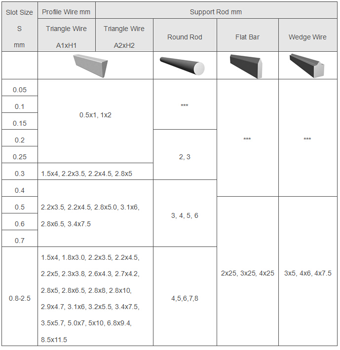 Support Rod: Triangle wire is common type. It can also be round rod, flat bar, wedge wire.
