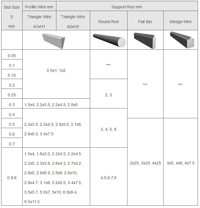 Support Rod: Triangle wire is common type. It can also be round rod, flat bar, wedge wire.