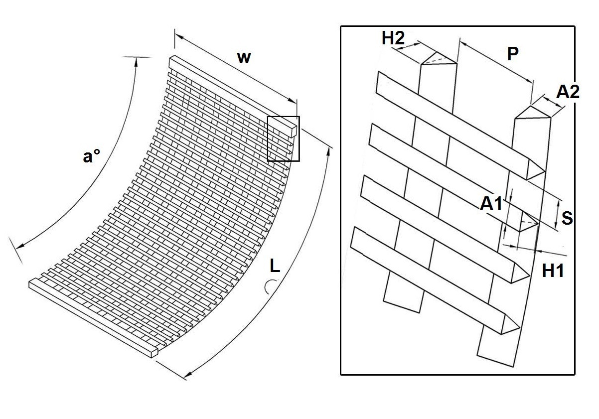 Agricultural sieve bend screen is manufactured by wrapping and welding stainless steel V-shaped profile wire cylindrically around support rods,then be made to panel screen through cutting and radian processing. Each profile wire and support rod is contacted by resistance welding. This screen is with features of firm in structure,good mechanical properties, high strength, rigidity and load capacity. For the section of profile wire is V shaped,the screen slot is narrow in the above and wide in the below,and thus be easy to leakage,wear and corrosion resistance, avoiding clogging and ensure smooth filtration.On the sieve bend screen, sieve slot direction is perpendicular to the material direction.The screen has a simple and practical structure, reliable operation, good effect of dehydration,separating solids and liquids depending on centrifugal force and gravity.It is an economical and practical solid-liquid separation equipment. In agricultural production,it is used in screw press machine for primary processing. It is mainly used for feed screening and manure separation,avoiding time-consuming and labor-intensive in transportation and expensive storage costs.and after separating,the by-products can be used for other fields,improving economic efficiency and reduce cost inputs. Such as,the separated solid particles can be sold as agricultural fertilizers,the separated liquid can irrigate farmland,meanwhile reducing storage costs and harmful impact of environmental health.