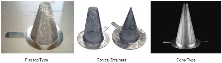 Conical strainers are preferably used. The cone is a perforated metal lined by a wire mesh ( fine or coarse).